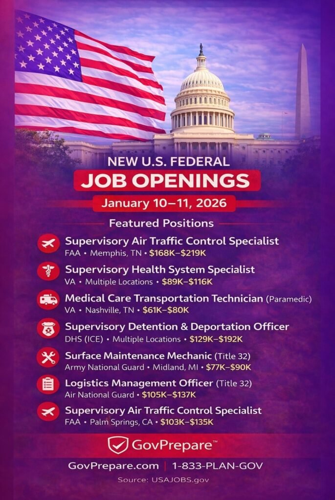 Newly Posted U.S. Federal Job Openings (Jan 10–11, 2026): FAA Air Traffic Leadership, VA Health Roles, ICE Supervisor, National Guard & More